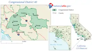 À partir du redécoupage de 2020, le 40e district congressionnel de la Californie est situé en Californie du Sud. Il comprend la majorité du nord et de l'est du Comté d'Orange, ainsi que le sud-ouest de San Bernardino.