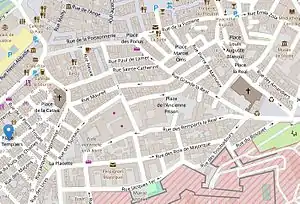 Le quartier est délimité par la rue Petite-la-Monnaie, la rue des Augustins, la rue de la Fusterie, la rue Emile Zola, la place Jean-Moulin, la Place des Esplanades et la rue des Remparts-la-Réal[1].