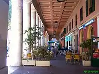 ![]() Le portique de la place Île-de-Beauté abrite à présent des cafés du côté de la rue Cassini. |