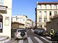 ![]() La rue de Foresta à son départ du monument aux morts. À droite le square Guynemer. |