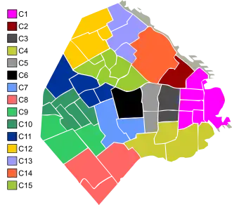 Les quartiers sont regroupés au sein d'une Comuna, pluriel Comunas. Ces Comunas sont numérotées, au même titre que le sont les arrondissements de Paris. En voici la liste par ordre numérique, ainsi que les quartiers sur lesquels elles s'étendent respectivement :