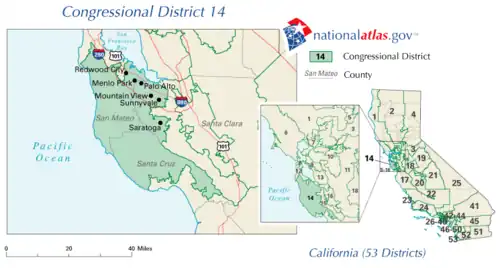 De 1993 à 2013, le 14e district se trouvait plus au sud, comprenant des parties des comtés de San Mateo, Santa Clara et Santa Cruz. Les villes du district comprenaient Mountain View, Sunnyvale, Menlo Park, Palo Alto, Half Moon Bay et Scotts Valley. Selon un rapport de 2006, le district était le troisième plus riche du pays[2]. Depuis le redécoupage par la California Citizens Redistricting Commission de 2011, la majeure partie de ce district est maintenant le 18e district, tandis que l'actuel 14e couvre la majeure partie de ce qui était le 12e district.