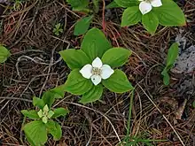 Le Quatre-temps[1] (Cornus canadensis), aussi nommé cornouiller du Canada, est une espèce de plante de la famille des Cornaceae. Il est une plante herbacée, ligneuse seulement à la base. Les tiges portant les fleurs sont dressées et peuvent atteindre 20 cm. Les feuilles à fortes nervures sont ovales en verticille. Les fleurs sont petites, verdâtres, formant un pseudo-capitule entouré de quatre à six bractées (long. 20 × 8–18 mm) involucrales blanches, pétaloïdes. Les fruits globuleux (diam. 20 × 5–6 mm) sont rouge vif. Ils sont comestibles.