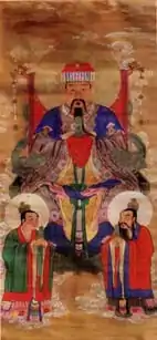 - Houtu Huangdizhi [4], Impératrice du sol. Cette déesse porte le nom d'une ancienne divinité de la terre formant un couple avec le dieu du ciel. Elle pouvait être représentée sous forme masculine, mais l’impératrice Wu Zetian a fixé définitivement sa forme féminine. L’impératrice Pan, épouse de l’empereur Zhenzong des Song, lui fit édifier un temple sur le mont sacré du centre. Elle gouverne les fluctuations du Yin et du Yáng, les naissances et la nature. Elle est fêtée le 18 du 3e mois.