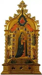 - L'Annonciation surmontant L'Adoration des mages (84 × 50 cm) ; panneaux de la prédelle : Vierge à l'Enfant et saints
