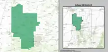 Depuis 2023, le 4e district congressionnel de l'Indiana est situé dans l'ouest de l'Indiana. Il comprend les comtés de Benton, Boone, Carroll, Clinton, Hendricks, Jasper, Montgomery, Morgan, Newton, Putnam, Tippecanoe, Warren et White dans leur intégralité, ainsi que des parties des comtés de Cass et Fountain et une ville du Comté de Howard.