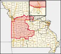 Le 4e district du Congrès du Missouri comprend l'ensemble des vingt comtés et des parties de quatre autres comtés : Barton, Bates, Benton, Boone (en partie), Camden (en partie), Cass, Cedar, Dade, Dallas, Henry, Hickory, Howard, Jackson (en partie) , Johnson, Laclede, Lafayette, Morgan, Pettis, Polk, Pulaski, Saline, St. Clair, Vernon et Webster (parties)[2].
