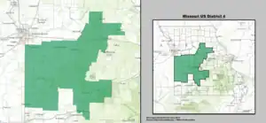 Le 4e district congressionnel du Missouri comprend le centre-ouest du Missouri. Il s'étend de la moitié nord de Columbia jusqu'aux banlieues sud et est de Kansas City, y compris une partie de Kansas City dans le Comté de Cass et des parties de Blue Springs dans le Comté de Jackson. Il comprend également la partie nord de Columbia, qui abrite l'Université du Missouri (mais pas l'université elle-même).