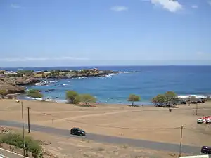 La plage de Quebra Canela en avant plan, le quartier de Palmarejo derrière, et l'île de Fogo au fond. | |