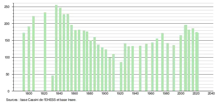 L'évolution du nombre d'habitants est connue à travers les recensements de la population effectués dans la commune depuis 1793. Pour les communes de moins de 10 000 habitants, une enquête de recensement portant sur toute la population est réalisée tous les cinq ans, les populations légales des années intermédiaires étant quant à elles estimées par interpolation ou extrapolation[18]. Pour la commune, le premier recensement exhaustif entrant dans le cadre du nouveau dispositif a été réalisé en 2005[19].