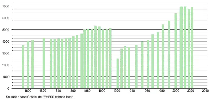 L'évolution du nombre d'habitants est connue à travers les recensements de la population effectués dans la commune depuis 1793. Pour les communes de moins de 10 000 habitants, une enquête de recensement portant sur toute la population est réalisée tous les cinq ans, les populations légales des années intermédiaires étant quant à elles estimées par interpolation ou extrapolation[28]. Pour la commune, le premier recensement exhaustif entrant dans le cadre du nouveau dispositif a été réalisé en 2007[29].