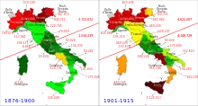 On remarque la forte émigration provenant du Mezzogiorno principalement à partir de 1900 et dans les décennies suivantes, alors que l'émigration des populations du nord avait jusque-là primé :