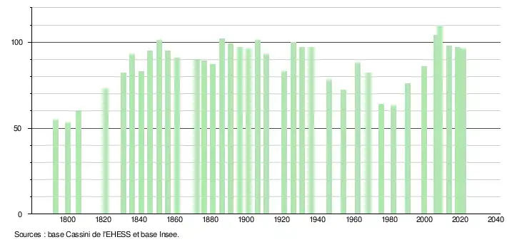 L'évolution du nombre d'habitants est connue à travers les recensements de la population effectués dans la commune depuis 1793. Pour les communes de moins de 10 000 habitants, une enquête de recensement portant sur toute la population est réalisée tous les cinq ans, les populations légales des années intermédiaires étant quant à elles estimées par interpolation ou extrapolation[15]. Pour la commune, le premier recensement exhaustif entrant dans le cadre du nouveau dispositif a été réalisé en 2008[16].