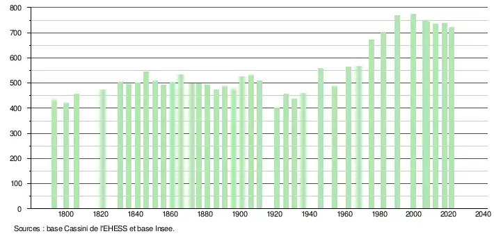L'évolution du nombre d'habitants est connue à travers les recensements de la population effectués dans la commune depuis 1793. Pour les communes de moins de 10 000 habitants, une enquête de recensement portant sur toute la population est réalisée tous les cinq ans, les populations légales des années intermédiaires étant quant à elles estimées par interpolation ou extrapolation[27]. Pour la commune, le premier recensement exhaustif entrant dans le cadre du nouveau dispositif a été réalisé en 2007[28].