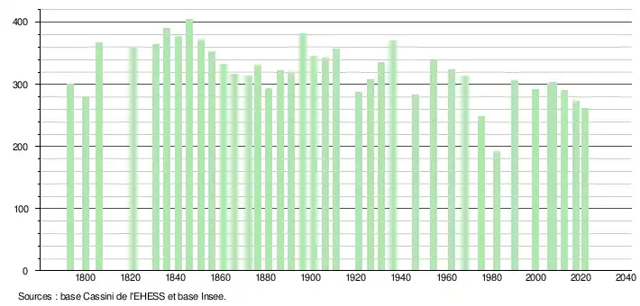 L'évolution du nombre d'habitants est connue à travers les recensements de la population effectués dans la commune depuis 1793. Pour les communes de moins de 10 000 habitants, une enquête de recensement portant sur toute la population est réalisée tous les cinq ans, les populations légales des années intermédiaires étant quant à elles estimées par interpolation ou extrapolation[35]. Pour la commune, le premier recensement exhaustif entrant dans le cadre du nouveau dispositif a été réalisé en 2007[36].