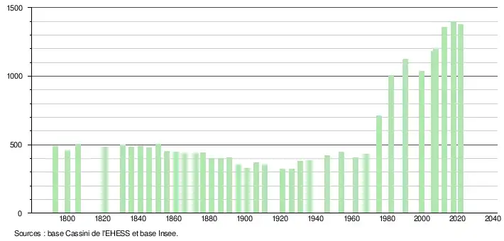 L'évolution du nombre d'habitants est connue à travers les recensements de la population effectués dans la commune depuis 1793. Pour les communes de moins de 10 000 habitants, une enquête de recensement portant sur toute la population est réalisée tous les cinq ans, les populations légales des années intermédiaires étant quant à elles estimées par interpolation ou extrapolation[34]. Pour la commune, le premier recensement exhaustif entrant dans le cadre du nouveau dispositif a été réalisé en 2007[35].