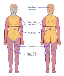 Elle attribue des multiples de 9 % de la surface corporelle totale à différents territoires cutanés : 9 % pour la tête et le cou, 9 % pour chaque membre supérieur, 18 % pour chaque membre inférieur, 18 % pour chaque face du tronc et 1 % pour le périnée.