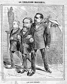 Pour sa part, le Parti radical, dans son désir de faire chuter le gouvernement, étendit la « coalition nationale » qu’il avait formée avec les républicains à l’occasion des élections municipales de décembre 1871 à l’autre parti anti-système, le carliste, sans qu’aucun des trois partis ne renonce à ses principes de « vaincre le Gouvernement fruit de l’immoralité et du mensonge » car « la liberté et l’honneur de la patrie […] sont au dessus de tout ». Plus tard, le Parti modéré se joignit également à la coalition. Au cours de la campagne, le parti eur recours à la rhétorique patriotique comme celle de « l’Espagne libre et indépendante » en allusion à l’origine italienne du roi ou comme l’argument utilisé par le républicain Emilio Castelar pour convaincre ses compagnons de parti d’appuyer la « coalition nationale », selon lequel elle s’était formée pour « défendre le gouvernement de l’Espagne par les Espagnols » et qui, dans le manifeste électoral républicain du 29 mars, s’exprima dans le slogan « l’Espagne pour les Espagnols ». Les partis de la « coalition nationale » s’engagèrent à présenter un unique candidat par district — celui du parti qui avait obtenu les meilleurs résultats aux élections précédentes — et à tous appeler au vote pour lui[45].
