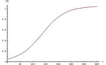 pour laquelle la loi de vitesse est . Après intégration par rapport au temps, les concentrations de A et B sont[2],[3]