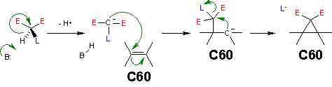 La réaction de Bingel est une méthode populaire dans la chimie des fullerènes. Le malonate (fonctionnalisé avec l'atome d'halogène) est souvent produit in situ via un mélange de base et de tétrabromométhane ou d'iode[2]. Il a également été observé que la réaction se produit en remplaçant les groupes ester par des groupes alcyne dans les dialcynylméthanofullerènes[2].