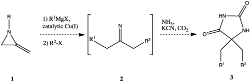 Dans un premier temps, la 2-méthylèneaziridine (1) réagit avec un réactif de Grignard et un dérivé halogéné R2-X, réaction catalysé par le Cu(I), provoquant l'ouverture du cycle de la 2-méthylèneaziridine et la formation d'une cétimine (2). La cétimine est mise en présence des réactifs de Bucherer-Bergs, formant une hydantoïne 5,5'- disubstituée (3). Cette réaction possède trois points de diversité chimique, la structure de l'aziridine initiale, celle du réactif de Grignard et celle du dérivé halogéné qui peuvent toutes être changées, permettant de synthétiser des hydantoïnes différentes[6].