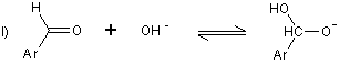 Dans le cas d'un aldéhyde avec un hydrogène sur le carbone en alpha, nous aurions une condensation aldolique. Des marquages isotopiques ont montré que la réaction se fait en deux étapes: