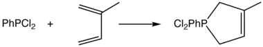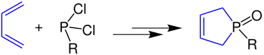 Dans cette cycloaddition, un phospholène est formé à partir de buta-1,3-diène et d'un dichlorophosphane :
