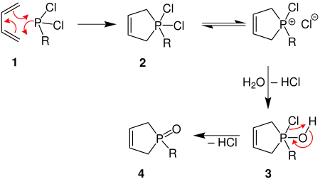 Dans cet exemple, le buta-1,3-diène (1) réagit avec le dichlorophosphane dans une réaction de cyclisation suprafaciale pour former un dichlorphosphole (2). Dans un équilibre, ce dernier s'ionise en cation phosphoreux, libérant un anion chlorure. La réaction avec l'eau produit de l'acide chlorhydrique, et un groupe hydroxyle vient substituer sur l'atome de phosphore (3). Dans une réaction intramoléculaire, le deuxième atome de chlore et l'hydrogène du groupe hydroxyle sont éliminés pour former l'oxyde de phospholène (4).
