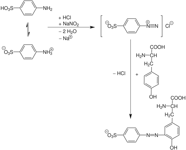 La première étape est la diazotation de l'acide sulfanilique par l'addition du nitrite de sodium en présence de l'acide chlorhydrique. A l’ajout de l’acide aminé, il y a formation d’une coloration rouge. L'ajout d'une solution de carbonate de sodium (Na2CO3) peut mieux révéler cette coloration.