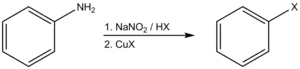De nos jours, on appelle « réaction de Sandmeyer » toute méthode de substitution d'un groupe amine aromatique via la préparation de son sel de diazonium suivie par son remplacement par un nucléophile en présence catalytique[note 1] de sels de cuivre(I).