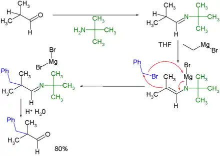 Par cette méthode, un composé carbonylé est converti en imine par une réaction de substitution avec une amine primaire. L'imine réagit ensuite avec un réactif de Grignard (dans l'exemple ci-dessus, le bromure d'éthylmagnésium CH3CH2MgBr) pour donner l'azaénolate de magnésium correspondant. La charge négative de cette espèce lui permet de déplacer un anion halogénure des halogénoalcanes moins réactifs, tels que les halogénures de méthyle, d'éthyle et d'autres composés non activés. L'hydrolyse donne là encore une cétone alkylée.