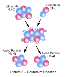 La réaction précédemment discutée intervient dans la fusion de l'hélium ; le 6Li et le deutérium réagissent en formant un noyau atomique intermédiaire, très excité, de 8Be, qui se désintègre très vite en produisant deux particules alpha. La figure suivante illustre cette réaction, les protons sont représentés par des sphères rouges, et les neutrons, par des sphères bleues.