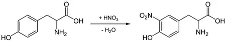 La nitratation de la tyrosine comme exemple de la réaction xanthoprotéique.