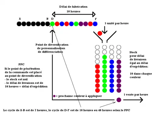 Le cycle de fabrication diffère suivant les deux cas ci-dessus détaillés. En effet, en travaillant à la commande, une boule peinte met 10 heures à traverser l'atelier, sinon elle met 40 heures (en moyenne). D'où l'intérêt de personnaliser ou de diversifier au plus tard, d'avoir des équipements flexibles vis-à-vis de la diversification.