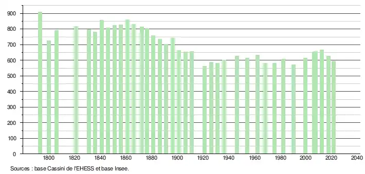 L'évolution du nombre d'habitants est connue à travers les recensements de la population effectués dans la commune depuis 1793. Pour les communes de moins de 10 000 habitants, une enquête de recensement portant sur toute la population est réalisée tous les cinq ans, les populations légales des années intermédiaires étant quant à elles estimées par interpolation ou extrapolation[19]. Pour la commune, le premier recensement exhaustif entrant dans le cadre du nouveau dispositif a été réalisé en 2007[20].