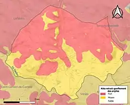 La commune est vulnérable au risque de mouvements de terrains constitué principalement du retrait-gonflement des sols argileux[27]. Cet aléa est susceptible d'engendrer des dommages importants aux bâtiments en cas d’alternance de périodes de sécheresse et de pluie. La totalité de la commune est en aléa moyen ou fort (76,3 % au niveau départemental et 48,5 % au niveau national). Sur les 1 488 bâtiments dénombrés sur la commune en 2019, 1 488 sont en aléa moyen ou fort, soit 100 %, à comparer aux 90 % au niveau départemental et 54 % au niveau national. Une cartographie de l'exposition du territoire national au retrait gonflement des sols argileux est disponible sur le site du BRGM[28],[Carte 3].