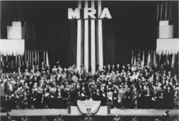 Mais c'est en Allemagne que le Réarmement moral conduit après-guerre l'une de ses plus vastes campagnes. Le , un groupe international comptant 260 personnes part de Zurich en bus en direction d'Ulm puis de Munich[32]. Pendant près de quatre ans, une centaine de personnes[33] du Réarmement moral vont se rendre dans toutes les régions et les villes du pays, où, pour beaucoup d'Allemands, leur visite marque la réouverture de l'Allemagne au monde extérieur. La pièce L'Élément oublié est jouée des centaines de fois, les radios interviewent des membres du groupe qui compte notamment d'anciens résistants au nazisme, par exemple les Norvégiens Leif Hovelsen[34] et Jens Wilhelmsen[35] ou la Française Irène Laure[36].