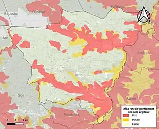 Le retrait-gonflement des sols argileux est susceptible d'engendrer des dommages importants aux bâtiments en cas d’alternance de périodes de sécheresse et de pluie[22]. 40 % de la superficie communale est en aléa moyen ou fort (91,8 % au niveau départemental et 48,5 % au niveau national)[Carte 2]. Depuis le , en application de la loi ELAN, différentes contraintes s'imposent aux vendeurs, maîtres d'ouvrages ou constructeurs de biens situés dans une zone classée en aléa moyen ou fort[Note 6],[23].