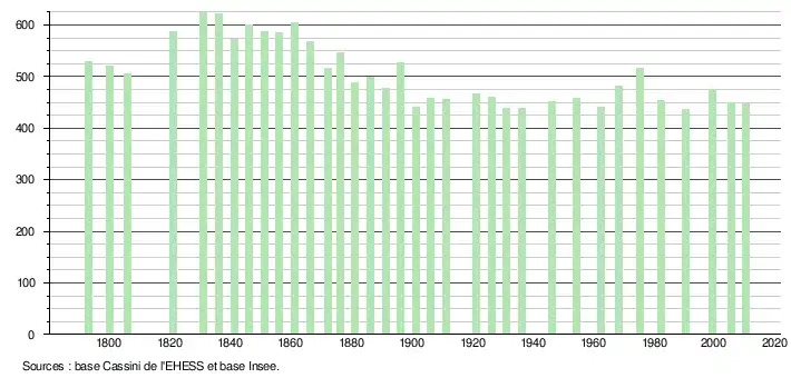L'évolution du nombre d'habitants est connue à travers les recensements de la population effectués dans la commune depuis 1793. À partir du , les populations légales des communes sont publiées annuellement dans le cadre d'un recensement qui repose désormais sur une collecte d'information annuelle, concernant successivement tous les territoires communaux au cours d'une période de cinq ans. Pour les communes de moins de 10 000 habitants, une enquête de recensement portant sur toute la population est réalisée tous les cinq ans, les populations légales des années intermédiaires étant quant à elles estimées par interpolation ou extrapolation[4]. Pour la commune, le premier recensement exhaustif entrant dans le cadre du nouveau dispositif a été réalisé en 2005[5],[Note 1].
