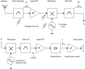 Le schéma ci-contre montre la structure du récepteur superhétérodyne courant utilisé en radiodiffusion AM.