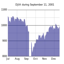 Le Dow Jones est quant à lui moins atteint par le crash du NASDAQ jusqu'aux attentats du 11 septembre 2001. Le marché boursier ferme jusqu'au , date à laquelle l'indice connaît sa plus forte chute depuis sa création en 1896 en chutant de 684,81 points soit 7,1 %. L'indice rebondit à la fin-2001 et se stabilise début-2002 avant de chuter à nouveau dans les deux derniers trimestres de 2002. Il faut attendre la mi-2003 pour qu'un rebond durable du marché ait lieu.