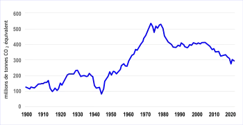 En 1800, les émissions sont estimées à environ 2 Mt CO2e/an. Elles augmentent jusqu’à environ 20 Mt CO2e/an en 1850 pour ensuite atteindre rapidement 100 Mt à la fin du XIXe siècle. Entre 1900 et 1950, si l’on omet les deux guerres mondiales, la hausse des émissions reste modérée, passant d’environ 100 Mt CO2e/an à environ 200 Mt CO2e/an. Des années 1950 jusqu’aux années 1970, une hausse beaucoup plus rapide a eu lieu, passant de 200 Mt CO2e/an à plus de 500 Mt CO2e/an. Le pic est atteint en 1973 avec 539 Mt CO2e/an, en lien avec le premier choc pétrolier. Il est suivi par une période de rebond jusqu'au deuxième choc pétrolier de 1979 (539 Mt CO2e/an). Dans les années 1980, les émissions baissent rapidement (-3 % par an), principalement par des réductions d’émissions dans le secteur Energie (mise en place du parc nucléaire) et Industrie (économies d’énergie, réglementations), malgré des émissions des transports et de l’agriculture à la hausse. Dans les années 1990 et le début des années 2000, les émissions des secteurs de l’énergie, de l’industrie et du résidentiel-tertiaire étant plutôt stables, et les émissions du transport et de l’agriculture à la hausse, les émissions totales ont connu une légère hausse (+1% par an dans les années 1990), jusqu’à atteindre, en 2005, un niveau similaire à 1991 (425 Mt CO2e en métropole et outre-mer UE). Depuis 2005, les émissions ont alterné entre des périodes de baisse rapide (-3 % par an de 2006 à 2009, -6 % en 2011, -9 % en 2014, -4 % en 2018) et des périodes de lente hausse (+2 % en 2010, +1 % en 2012-2013 et en 2015-2017)[23].