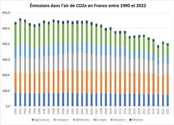 En 2021, la France (Métropole et Outre-mer inclus dans l'UE) a émis 414,8 Mt CO2e, hors puits de carbone, ce qui reste inférieur au niveau d’avant crise sanitaire (431,1 Mt CO2e en 2019), mais supérieur à 2020 (392,3 Mt CO2e) dont le faible niveau était lié à la crise sanitaire mondiale de la Covid-19. Ce rebond est particulièrement marqué pour les transports (+12,4 %) et pour l’industrie (+8,2 %). Entre 1990 et 2021, les émissions annuelles de gaz à effet de serre en France (Métropole et Outre-mer inclus dans l’UE ; hors secteur UTCATF) sont passées de 544 Mt CO2e en 1990 à 415 Mt CO2e en 2021, soit une baisse de 24 %[24].
