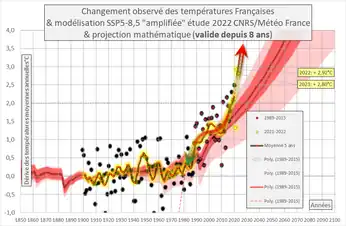En France métropolitaine, 2022 a été l'année la plus chaude jamais enregistrée depuis le début des mesures en 1900, la température annuelle moyennée sur le pays a atteint en effet 14.5 °C soit 1.6 °C de plus que la normale climatique 1991-2020 détrônant 2020 (+1.1 °C avec 14.1 °C)[5],[6]. De 1900 à 2021, les températures moyennes ont augmenté d’environ 1,7 °C, une valeur plus forte que celle observée en moyenne mondiale (+ 1,2 °C)[7]. Selon une étude publiée le dans la revue « Earth System Dynamics » par deschercheurs du CNRS, du CNRM, et du Centre européen de recherche et de formation avancée en calcul scientifique (Cerfacs), se fondant sur des données depuis 1899 récoltées par une trentaine de stations météorologiques réparties sur le territoire pour mesurer le réchauffement actuel et futur, la température moyenne de la France actuelle est de 1,66 °C supérieure à la période 1900-1930, dont la quasi-totalité (1,63°C) serait due uniquement aux activités humaines[8],[9]. Le réchauffement est légèrement plus marqué sur le Sud que sur le Nord du pays. La température a davantage augmenté en fin de nuit (température minimale) que le jour (température maximale). Les 10 années les plus chaudes du siècle sont toutes postérieures à 1988[10].