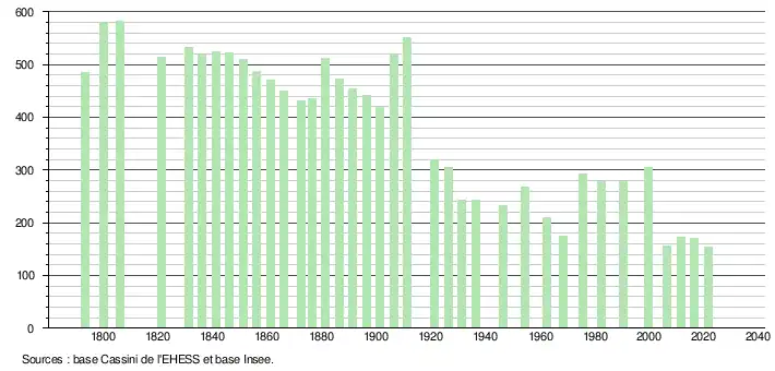 L'évolution du nombre d'habitants est connue à travers les recensements de la population effectués dans la commune depuis 1793. Pour les communes de moins de 10 000 habitants, une enquête de recensement portant sur toute la population est réalisée tous les cinq ans, les populations légales des années intermédiaires étant quant à elles estimées par interpolation ou extrapolation[16]. Pour la commune, le premier recensement exhaustif entrant dans le cadre du nouveau dispositif a été réalisé en 2006[17].