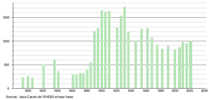 L'évolution du nombre d'habitants est connue à travers les recensements de la population effectués dans la commune depuis 1793. Pour les communes de moins de 10 000 habitants, une enquête de recensement portant sur toute la population est réalisée tous les cinq ans, les populations légales des années intermédiaires étant quant à elles estimées par interpolation ou extrapolation[26]. Pour la commune, le premier recensement exhaustif entrant dans le cadre du nouveau dispositif a été réalisé en 2005[27].