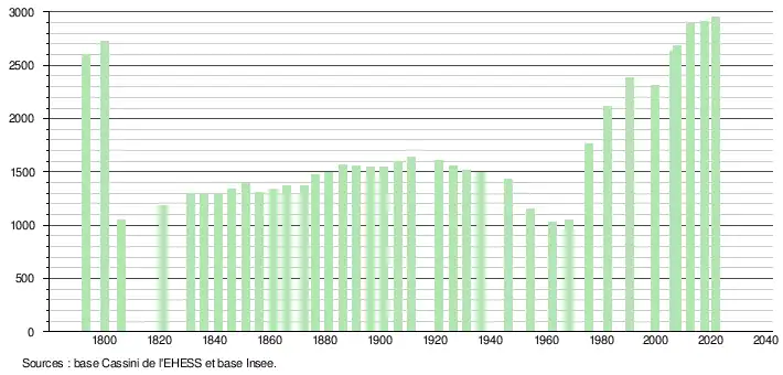 L'évolution du nombre d'habitants est connue à travers les recensements de la population effectués dans la commune depuis 1793. Pour les communes de moins de 10 000 habitants, une enquête de recensement portant sur toute la population est réalisée tous les cinq ans, les populations légales des années intermédiaires étant quant à elles estimées par interpolation ou extrapolation[28]. Pour la commune, le premier recensement exhaustif entrant dans le cadre du nouveau dispositif a été réalisé en 2007[29].
