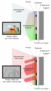 Par sa longueur d'onde plus élevée que la lumière visible, la lumière infrarouge est absorbée par des pigments et substrats différents du spectre visible. Ainsi, elle traverse de nombreuses couches de peintures opaques à la lumière visible, mais reste absorbée par certains composants, notamment les couches à base de carbone et les accumulations de peintures. Enfin, les préparations de fond de toile reflètent cette lumière.