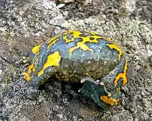 Sonneur à ventre jaune dans la position du réflexe d’Unken. La partie la plus visible est le ventre.
