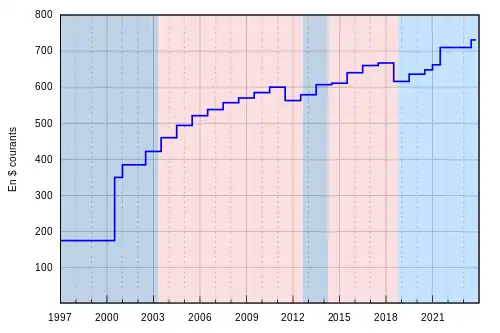 | Entrée en vigueur | Montant | Gouvernement | Réf. | |